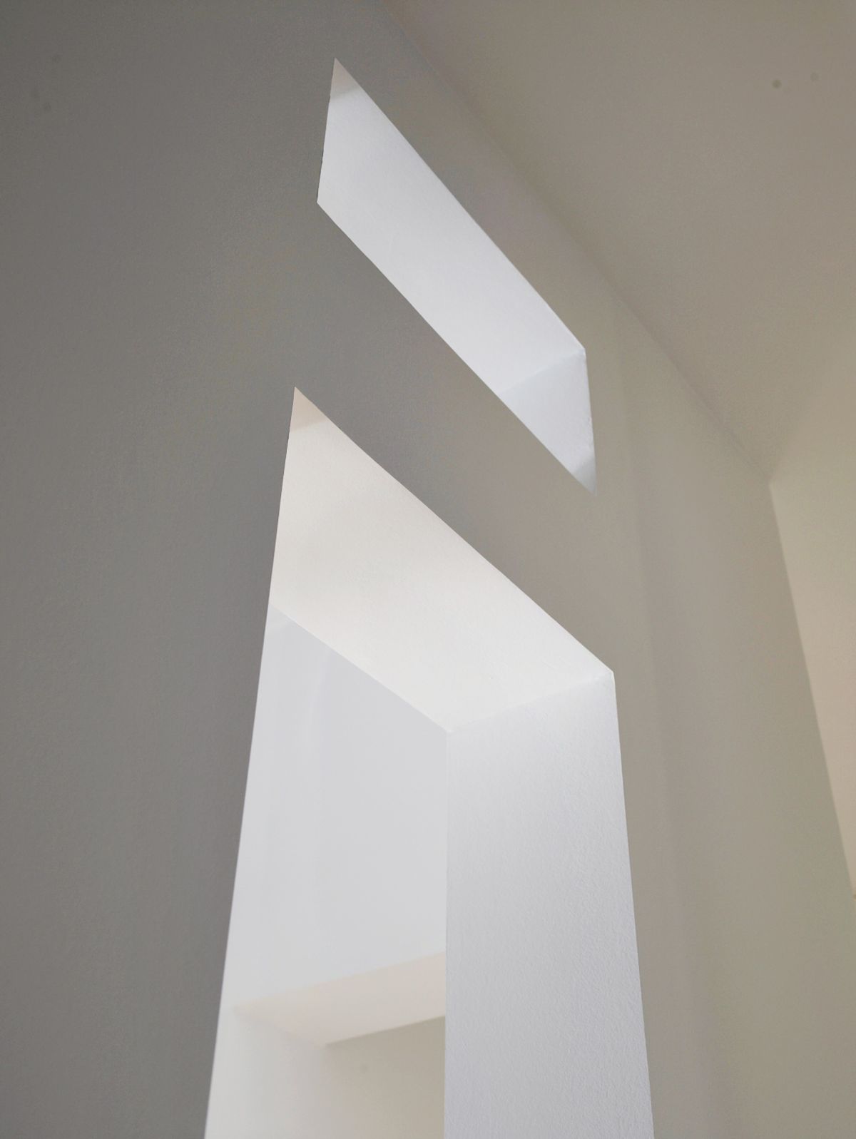 In one of the two longitudinal load-bearing walls, I expand the existing door-hole, leading to the kitchen, to the maximum possible. Opposite this expanded hole, I establish two narrow holes, allowing passage from kitchen to studio, where the most time is spent. - A short-cut for bringing the always needed coffee! At the same time those new wall-holes makes the whole apartment more transparent and improves the day-light and sun-light-passage in both sides of the relatively wide apartment.