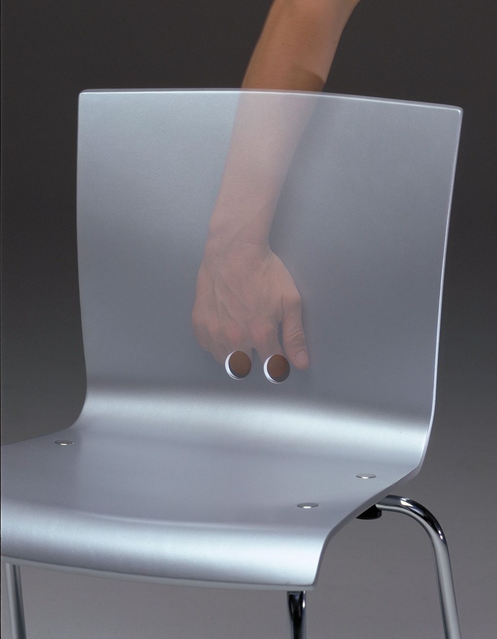 To give the chair a nice handle, combined with a significant character (both very often missing on those kinds of chairs), I added the two holes to the shape.