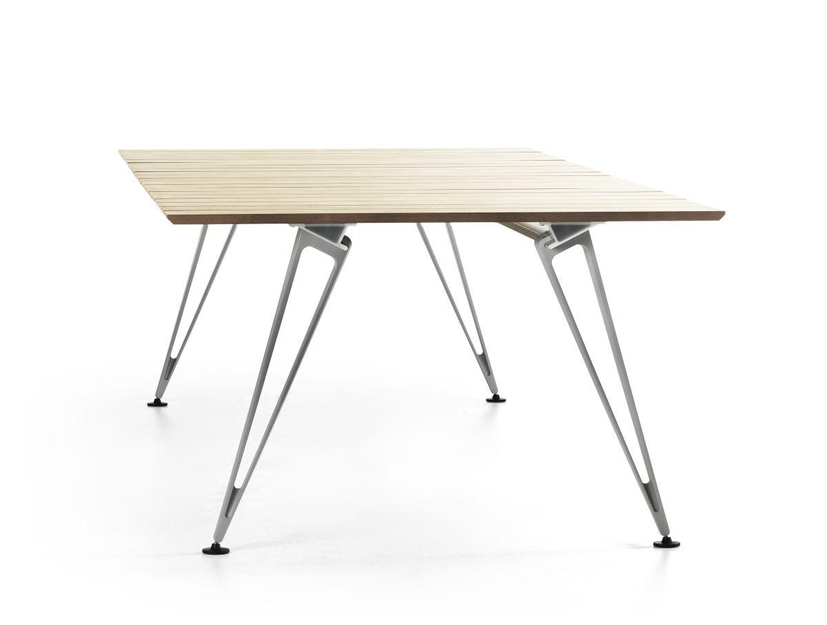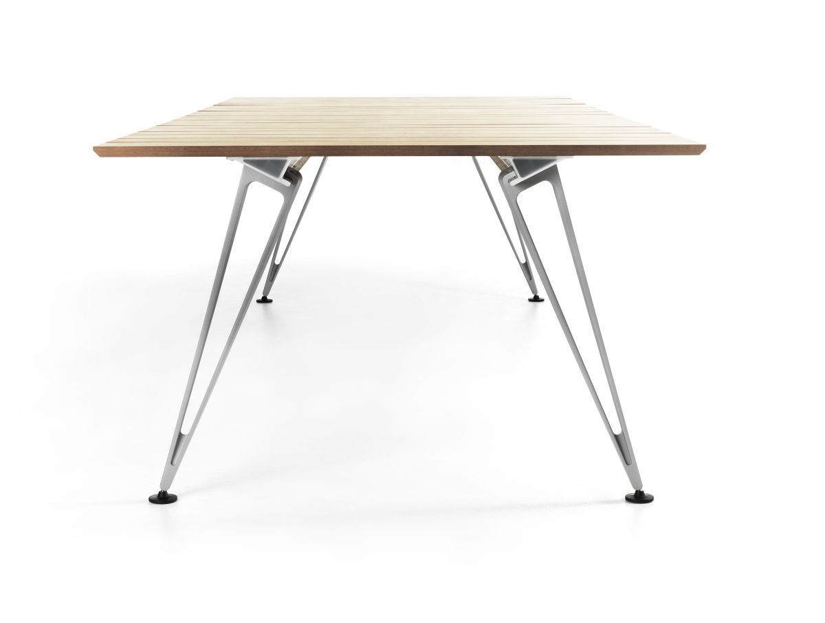 Attach Outdoor uses the same innovative structure as ATTACH table-system, with the extruded aluminum beams and attachable legs of cast aluminum, but is here combined with wooden slats instead of a table-top, allowing water to run through. This makes Attach Outdoor the perfect choice for the office atrium, home garden or outdoor restaurant.