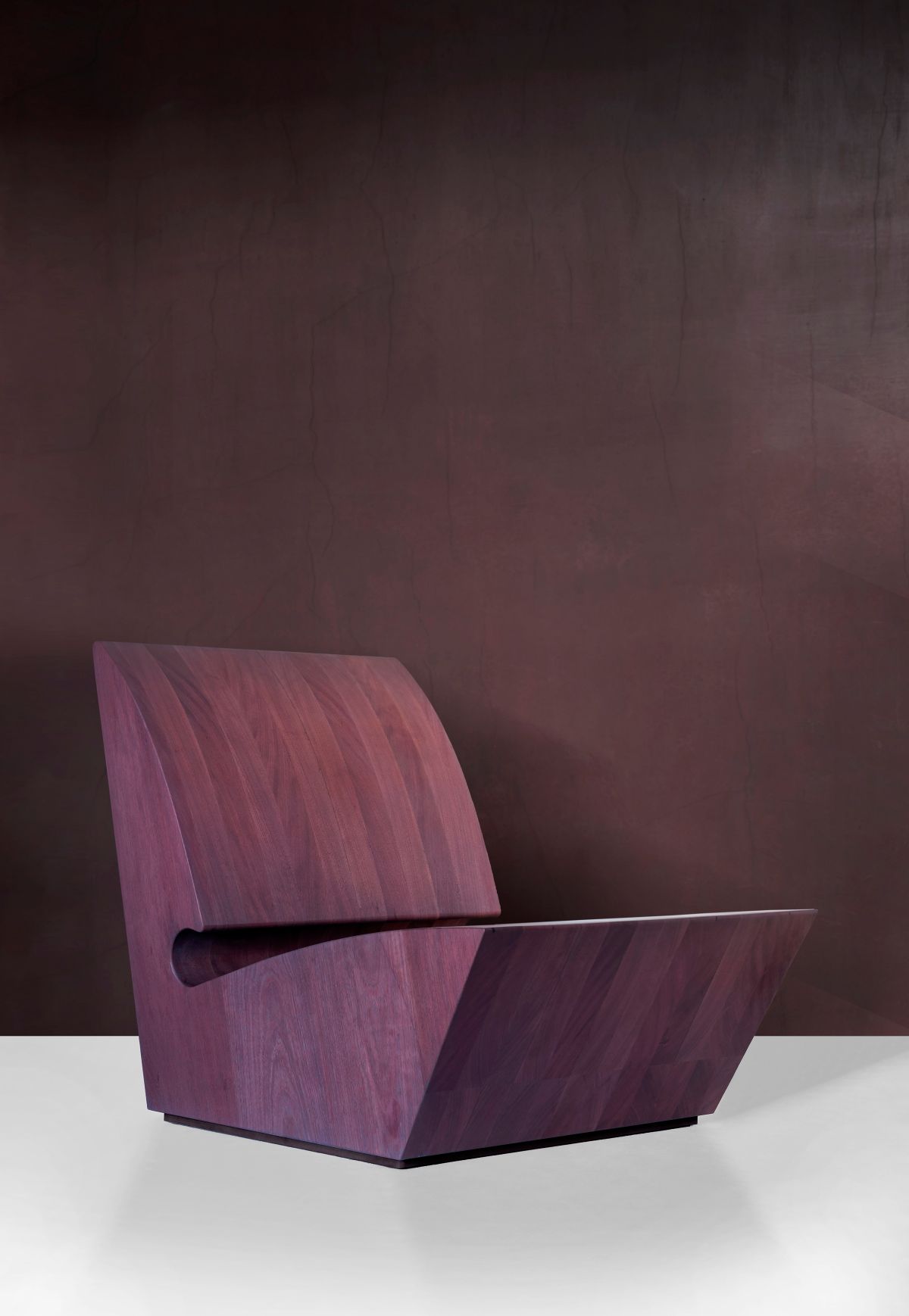 RUM (Danish for “Space”) is a throne constructed around two vertical cones. Seventeen identical elements make up the whole, encircle the sitter and question how many – or how few- identical elements it takes to create a monolithic, unified form. The chair is technically demanding, not least in the sophisticated triangular joint under the seat, where the tapered slats come together in one precise point. The chair appears most monolithic when seen form the back, appealing to the imagination as it does not really appear as a chair.