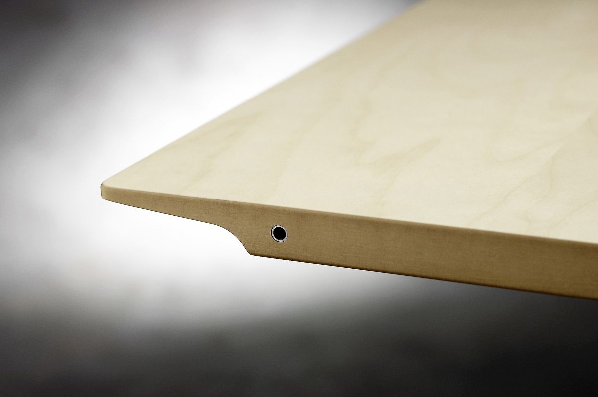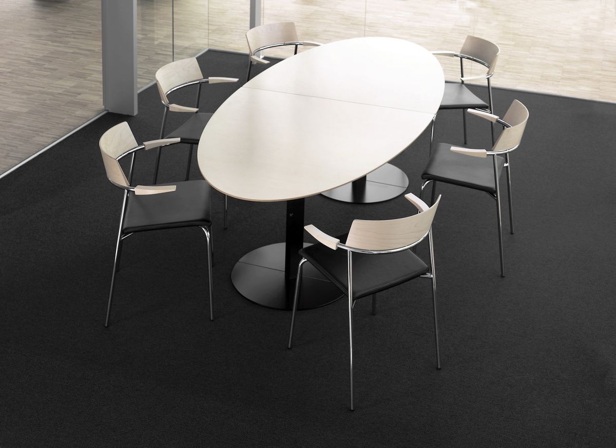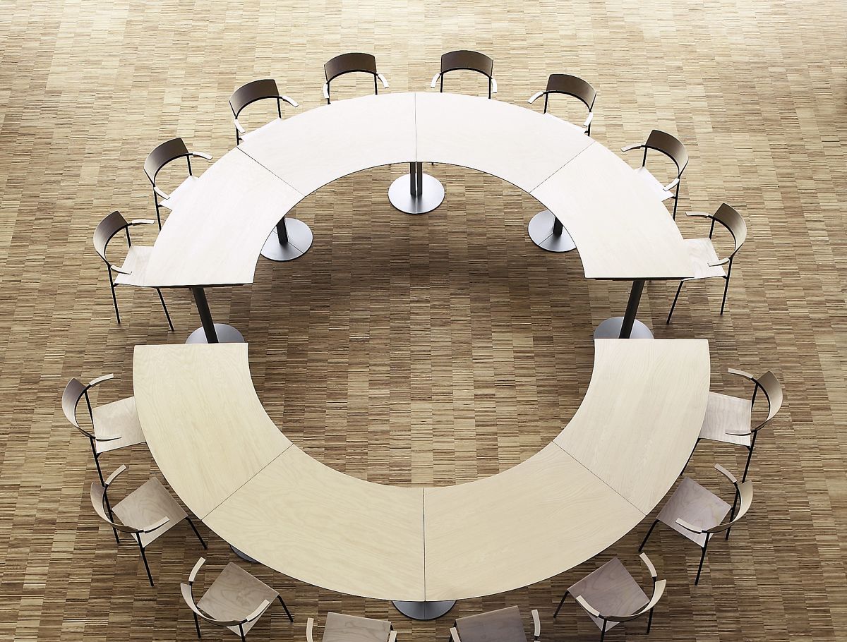 This series of column-tables is based on an idea of mine, dating back to the middle-nineties. The main-idea is quite simple: Instead of having a normal full-circle-base, I here work with a semicircular base. The column can be mounted to the tabletop in two ways: With the straight side of the base outwards – and exactly in line with the gavel of the tabletop – or with the straight side inwards. The latter way is well suited for smaller solitary tables, while the first mentioned gives the possibility to add and couple more tables. When doing that, the bases together forms complete circles and larger table-settings will appear as an architectonically calm wholeness with a minimal number of supports.