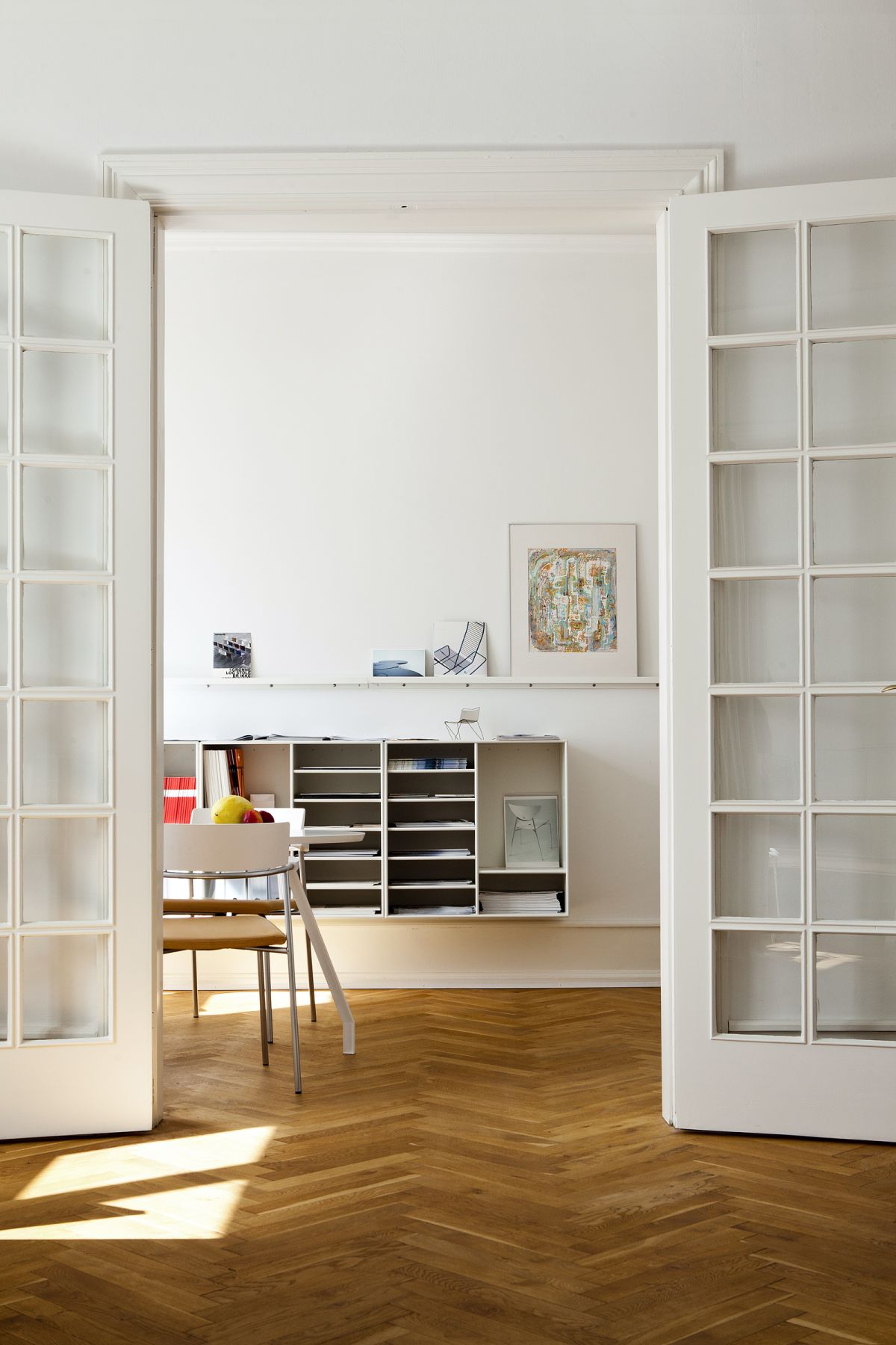 The interior-design and furnishing of the studio and living-area is deliberately kept extremely simple – and light in colors - in order to let the excellent view and day-light play the main-roles. The absence of curtains, potted plants and low-hanging pendular-lightings accentuate this theme. Artificial light comes from spots mounted in beams in the ceiling. The high positioning also helps to avoid mirror-effects in the windows, during night-time. The furniture is mainly in my own design, including special-made tables in meeting-room, studio and kitchen.