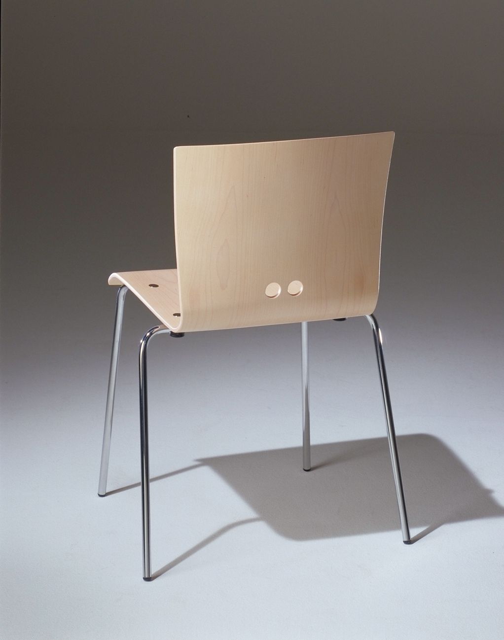 To give the chair a nice handle, combined with a significant character (both very often missing on those kinds of chairs), I added the two holes to the shape.