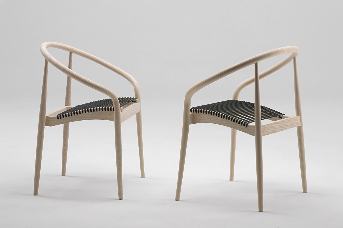 The back embraces the sitting person and the forgiving rubber-strings of the seat adds a feeling of comfort.