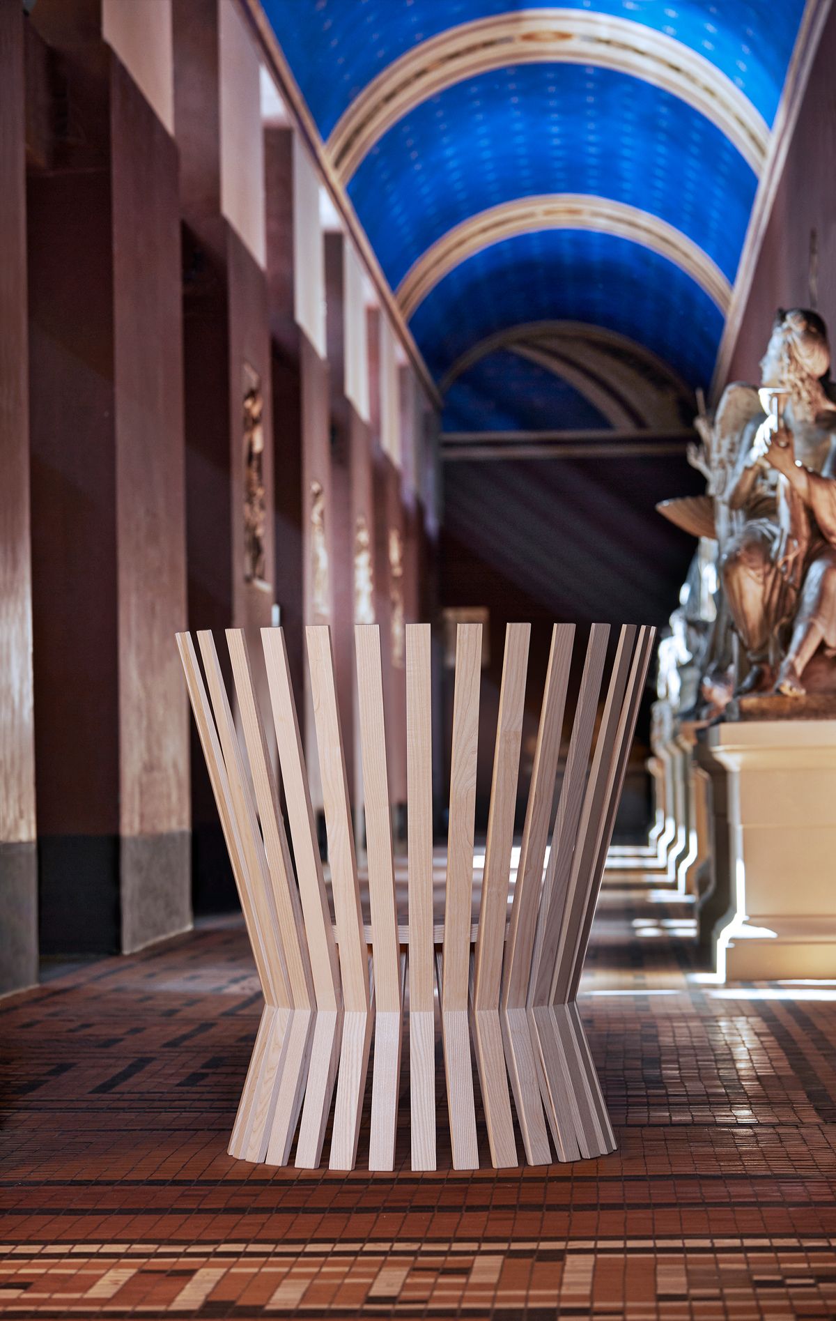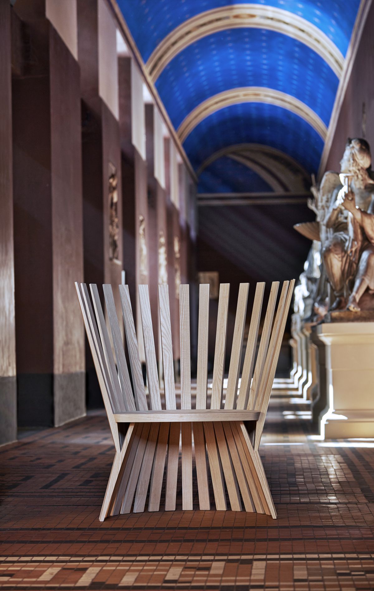 RUM (Danish for “Space”) is a throne constructed around two vertical cones. Seventeen identical elements make up the whole, encircle the sitter and question how many – or how few- identical elements it takes to create a monolithic, unified form. The chair is technically demanding, not least in the sophisticated triangular joint under the seat, where the tapered slats come together in one precise point. The chair appears most monolithic when seen form the back, appealing to the imagination as it does not really appear as a chair.