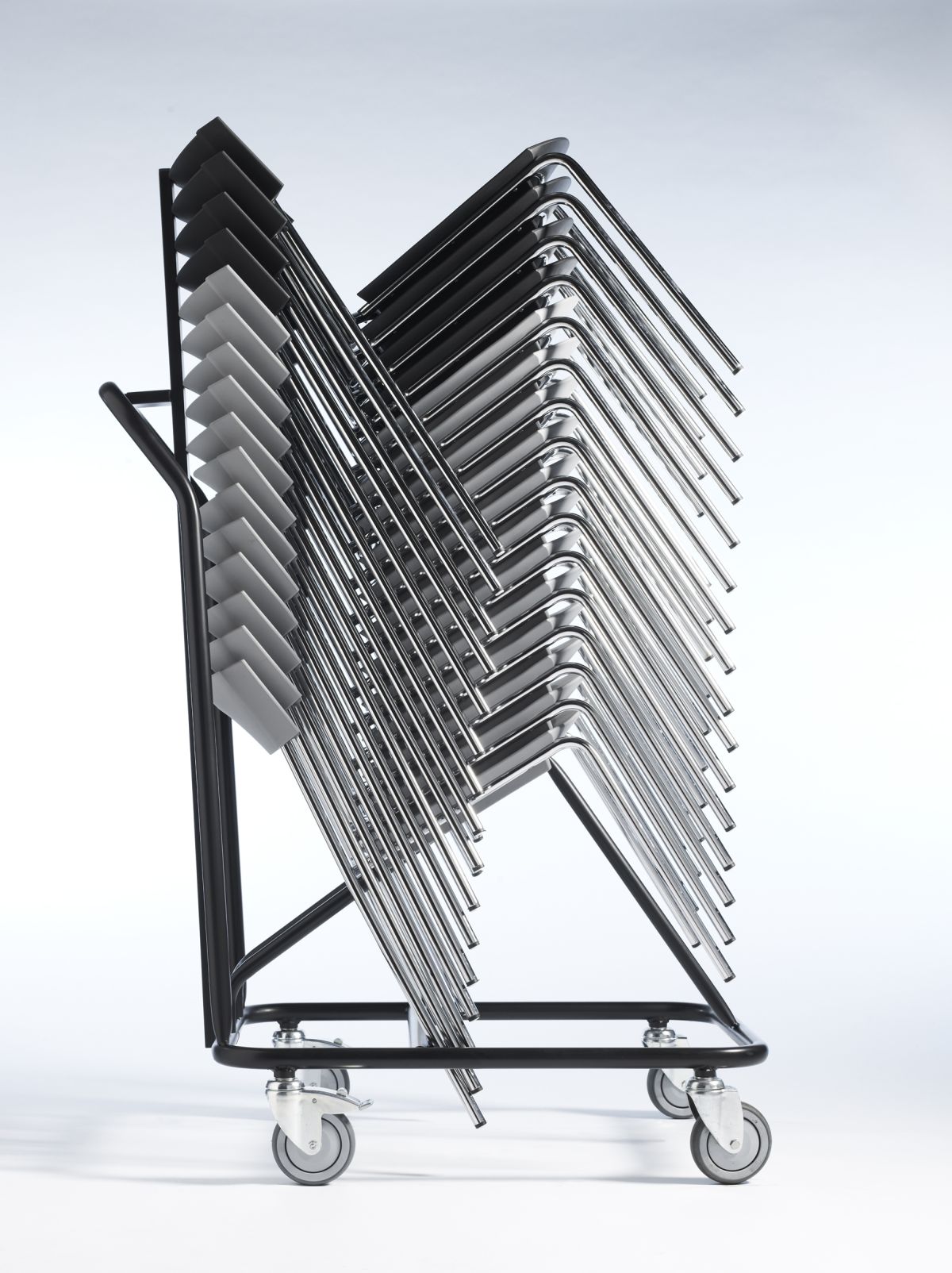There is an integrated stacking spacer under the seat which facilitates quiet stacking without leaving marks on the chair underneath. The chair is shock resistant, cleanable and when fitted with the optional galvanized frame, can be used outdoors. The standard frame is in chromed steel and the seat/back are available in different striking colours.