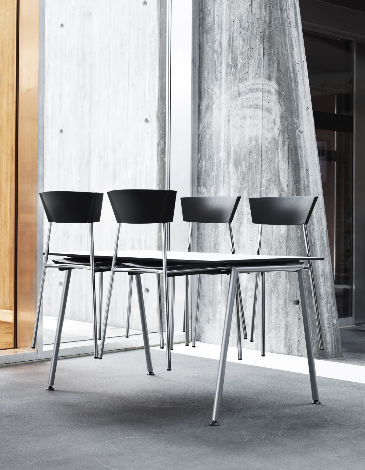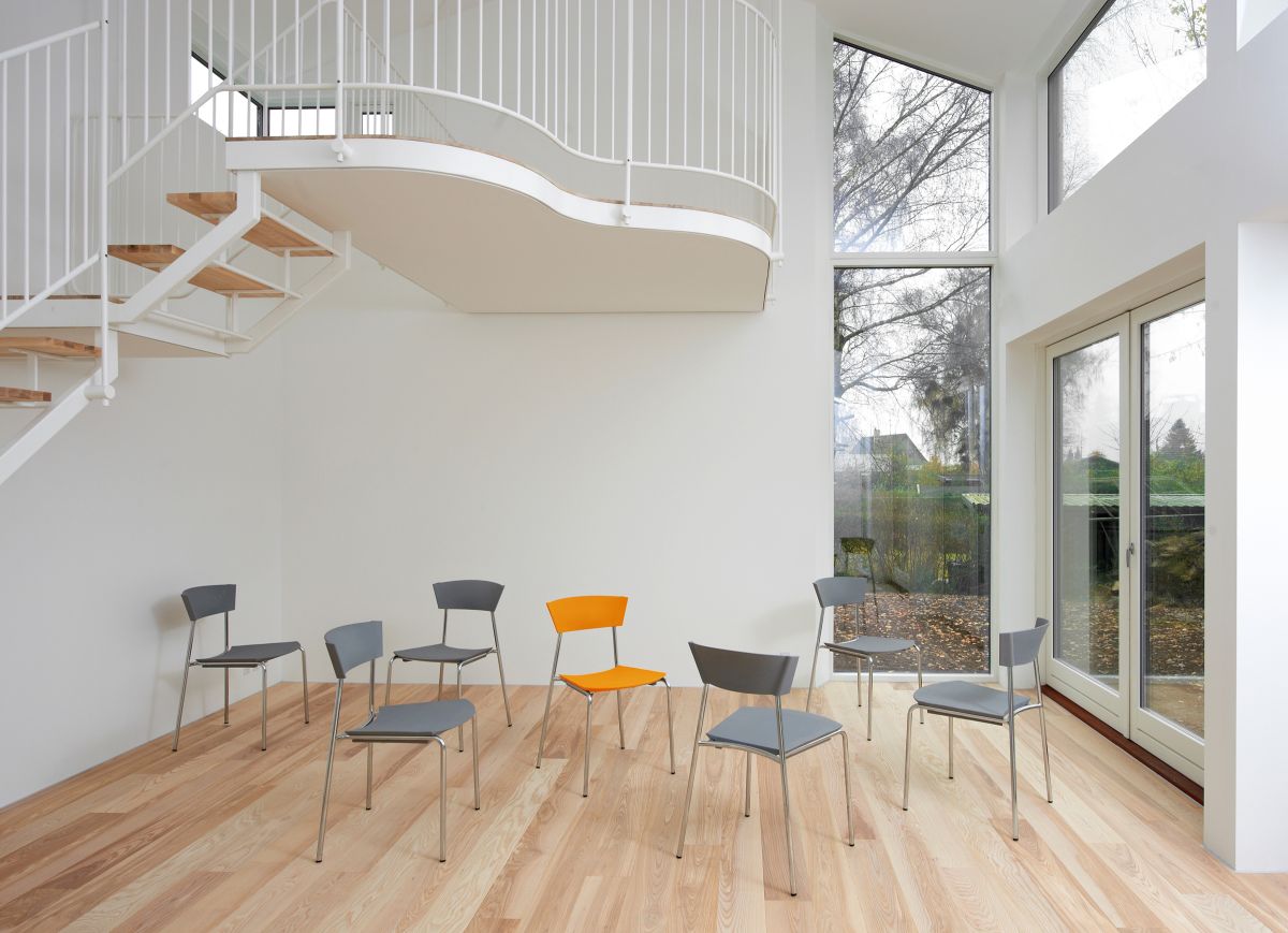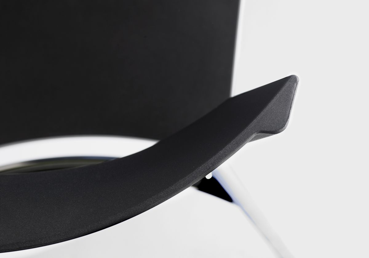 The sculpted and strong double curved shape of the back fully demonstrates the design possibilities of moulding the elastic polyurethane material. This contributes to the chair’s exceptional comfort – whether you sit slightly forward, for example when you eat, or whether you lean back listening to a lecture.